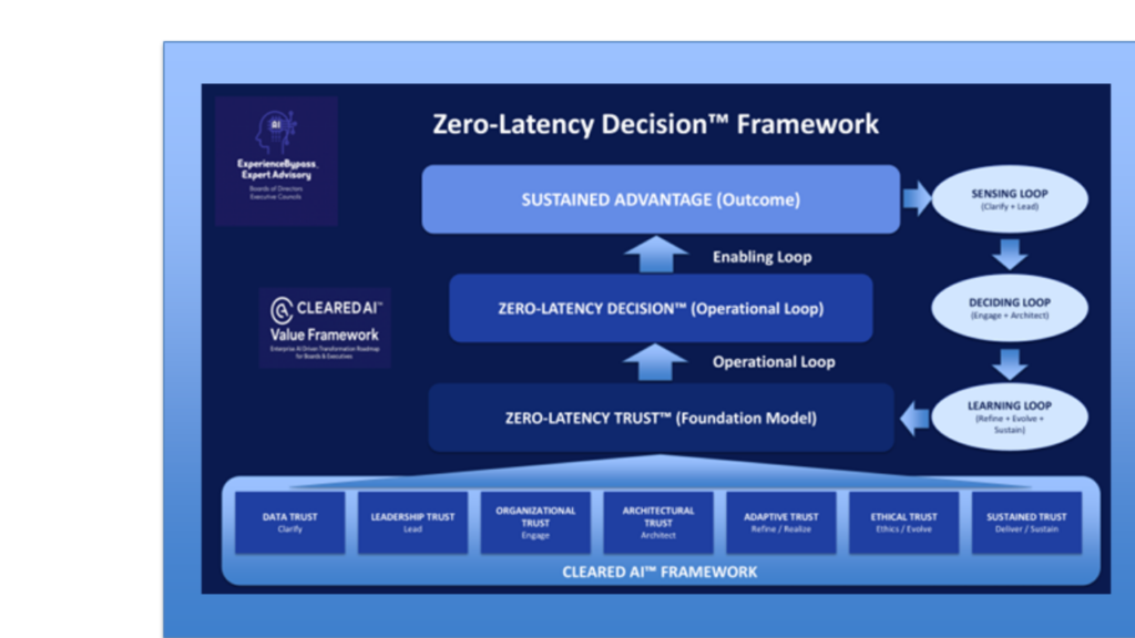In this model, Zero-Latency Trust fuels Zero-Latency Decision™, compounding into Enterprise Intelligence, the ultimate strategic advantage. This is not about change programs; it’s about building a self-learning organization where humans and AI co-orchestrate outcomes, sense risk in real time, and decide at the speed of relevance.